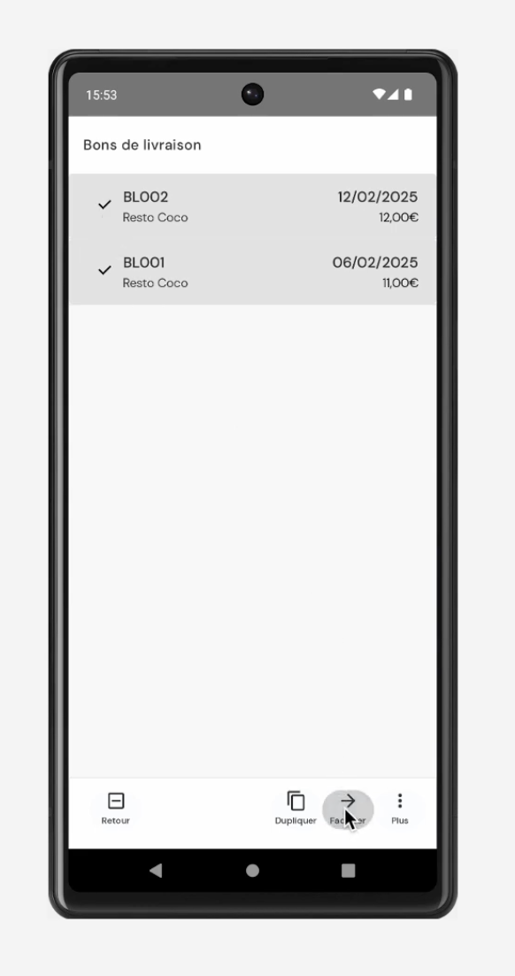 Depuis lâonglet « Bons de livraison », sĂ©lectionnez un ou plusieurs bons de livraison que vous souhaitez facturer